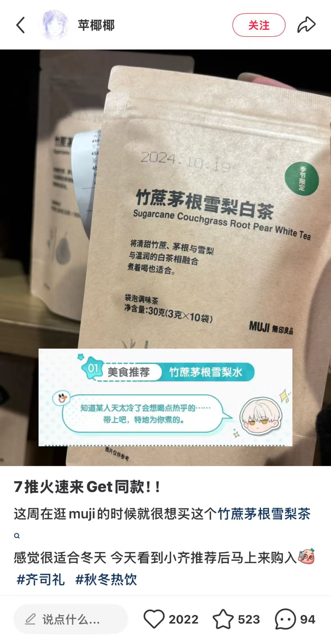 “光夜”男主齊司禮在美食推薦裏提及“竹蔗茅根雪梨水”,便讓齊夫人紛紛走進無印良品get同款。