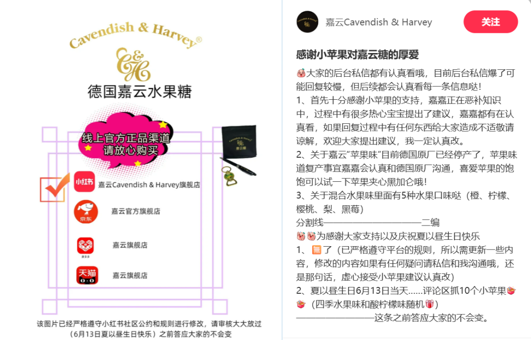 嘉雲糖面對突如其來的流量不僅反應速度極快,更是出乎玩家意料的“懂事”。銷量暴漲當天,嘉雲糖小紅書官號就發文向玩家表示感謝,標題裏稱呼玩家為“小蘋果”顯然是做足功課而來,正文裏對“哥推”的需求和建議也一一作出回應。比如玩家呼聲極高但已經停產的蘋果味,官方表示會與德國方面溝通復產事宜,同時也不忘以附送贈品的方式與玩家共同慶祝夏以晝生日。