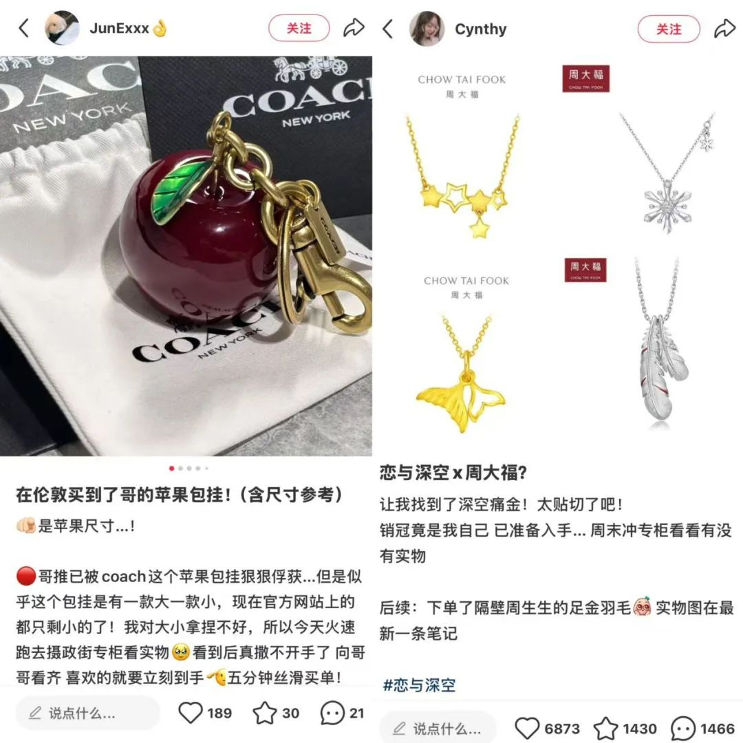 比如周大福店內在售的魚尾、雪花、羽毛、星星造型吊墜,Coach推出的蘋果造型包掛,就因為與《戀與深空》五位男主的要素標籤所對應而成為“獵人小姐”間的熱銷品。