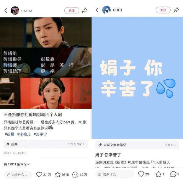 其實從全平台傳播來看,《折腰》的話題發酵是多元的。**《折腰》開播當日,“牛馬剪輯助理廖娟”在小紅書引爆了第一個話題熱點,出人意料又極易令人共情。**因“廖娟”的署名出現在多部優質劇中,觀眾在肯定劇集剪輯節奏的同時,還十分關心“娟子”為何還沒升職,並以豐富的職場經驗推測,“娟子”署名最靠後、但幹活可能是最多的。