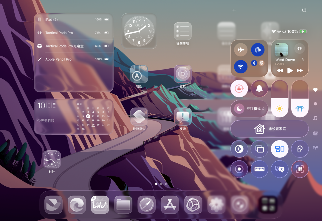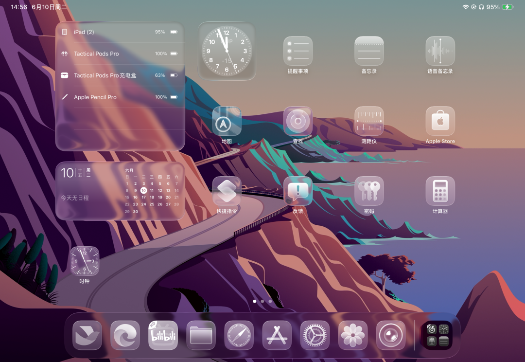 而且你還可以把所有圖標都改成液態玻璃模式(第三方 App 圖標能夠自適應),Dock 欄、各種交互按鈕也都是液態玻璃的樣子。