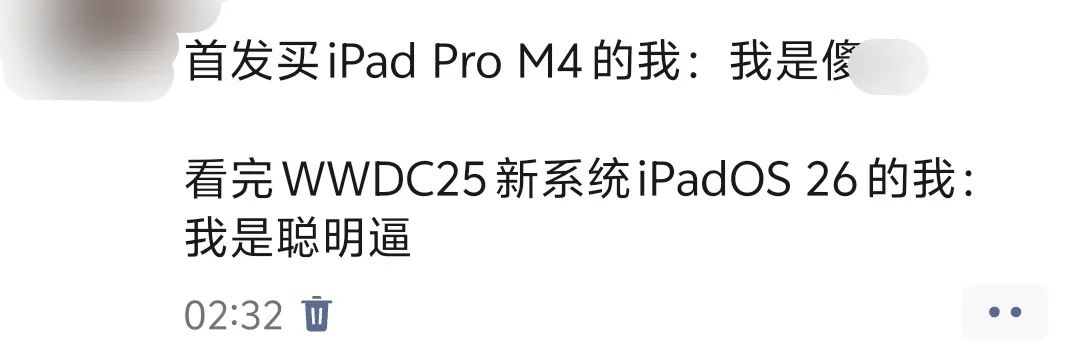 編輯部之前斥巨資 8999 元首發購買 M4 iPad Pro 的同事,本來覺得自己還挺怨種的,看完 WWDC 直接去朋友圈發瘋了。