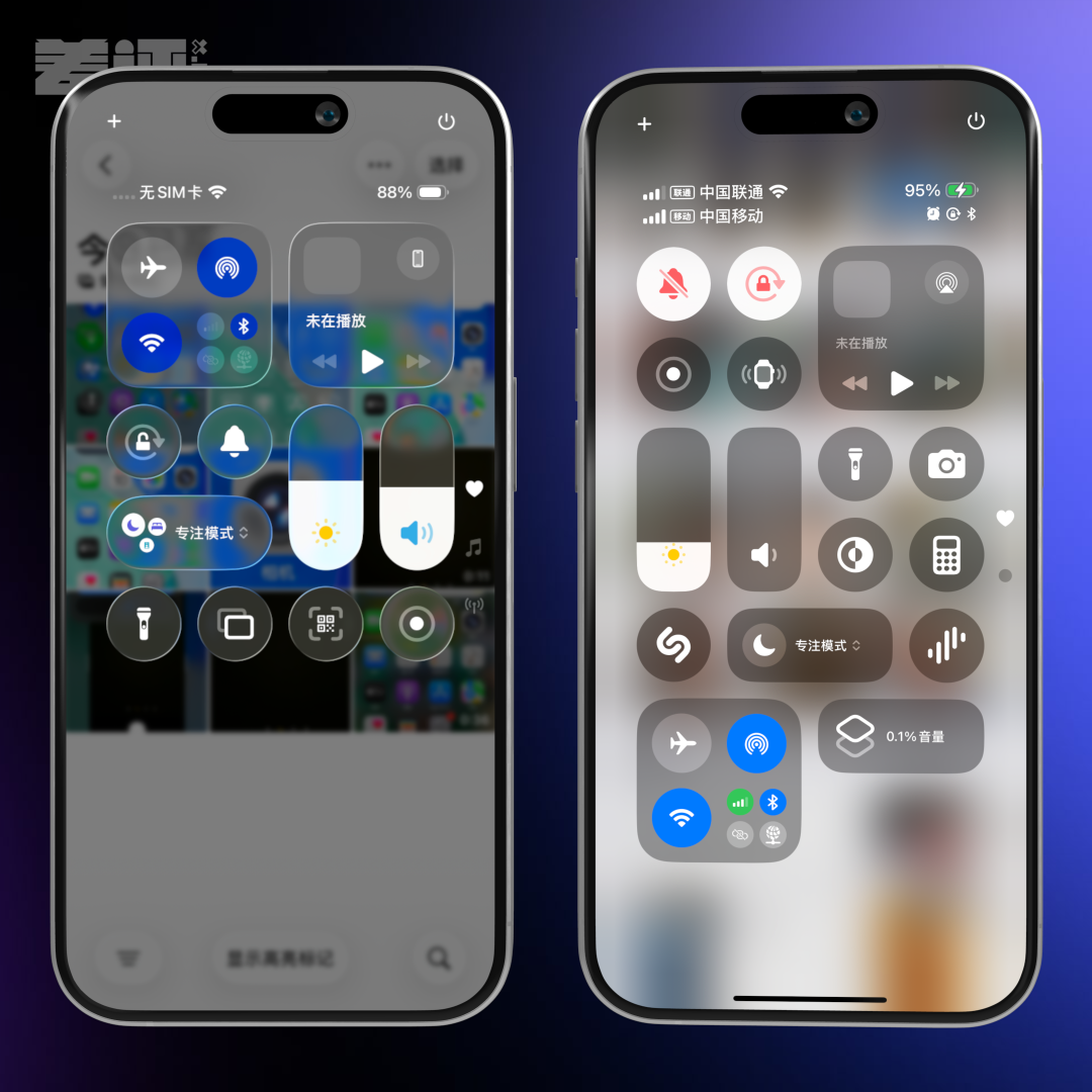 這樣的情況還出現在控制中心,當背景是照片 App 這種比較花哨的界面時,iOS 26 確實要比 iOS18 看上去費勁兒。