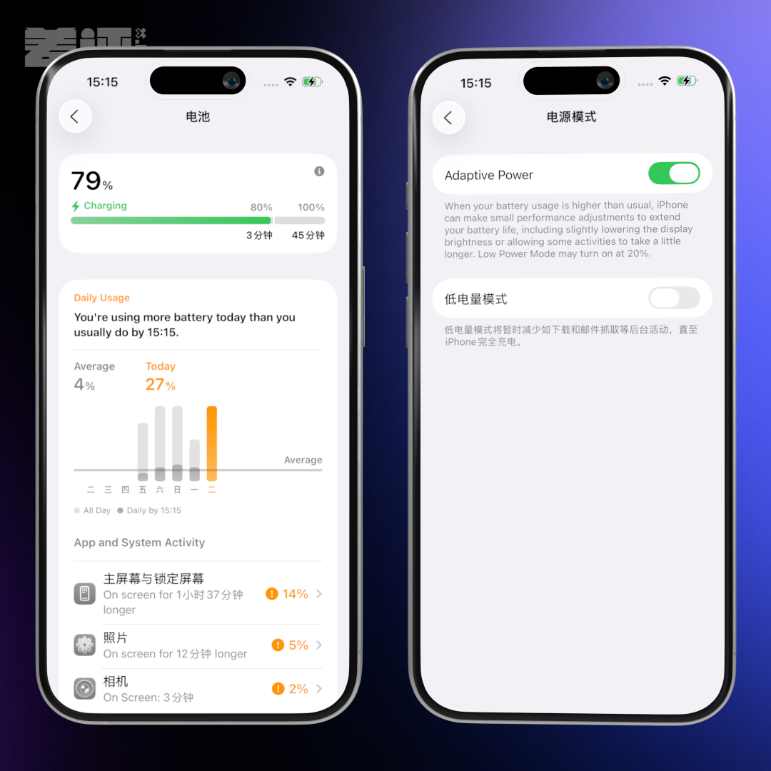 同時電源模式新增了一個 Adaptive Power 自適應電源模式,簡單來講就是當你的耗電量高於正常水平時,iPhone 會稍微降低性能來延長續航,比如降低屏幕亮度,電量剩 20% 時自動打開低電量模式等等。