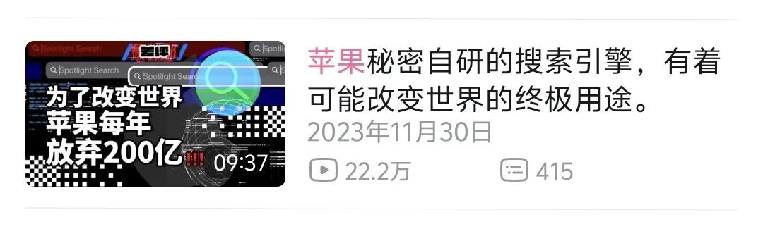 但是這也讓託尼想到我們在 2023 年做過的一期視頻,提到了蘋果自研搜索引擎,就是為了增強 Spotlight 的能力。