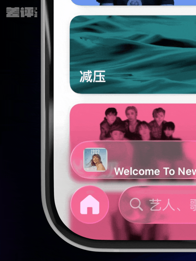 Apple Music 裏的專輯劃過 Tab 欄的底部時,真的好像被玻璃擋住了一樣。