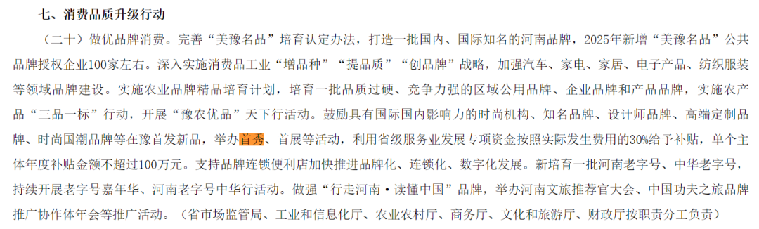 而回到金魚汽車上,除了前頭抽象的招商會和依舊餅味十足的加盟話術以外,我還發現今年河南省剛好發了一個擴大消費的政策文件,裏頭提到國內國際的知名品牌只要在河南舉辦首秀首展活動,就能拿到補貼。