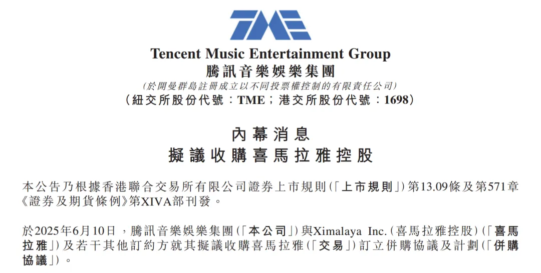 36氪獲悉,騰訊音樂發佈公告稱,騰訊音樂與喜馬拉雅及其他若干訂約方就擬收購喜馬拉雅簽訂併購協議及計劃。受限於交割前提條件的滿足,騰訊音樂擬以下述對價全資收購喜馬拉雅:(1)12.6億美元現金;(2)總數不超過總股數5.1986%的騰訊音樂A類普通股(總股數為不晚於交易交割前五個工作日的工作日當天騰訊音樂已發行及發行在外的普通股);及(3)受限於併購協議的條款規定,喜馬拉雅的創始股東在交割時及之後將分批獲得的總數不超過總股數0.37%的騰訊音樂A類普通股。此外,根據併購協議,喜馬拉雅將進行與交易相關的若干現有業務的重組。
