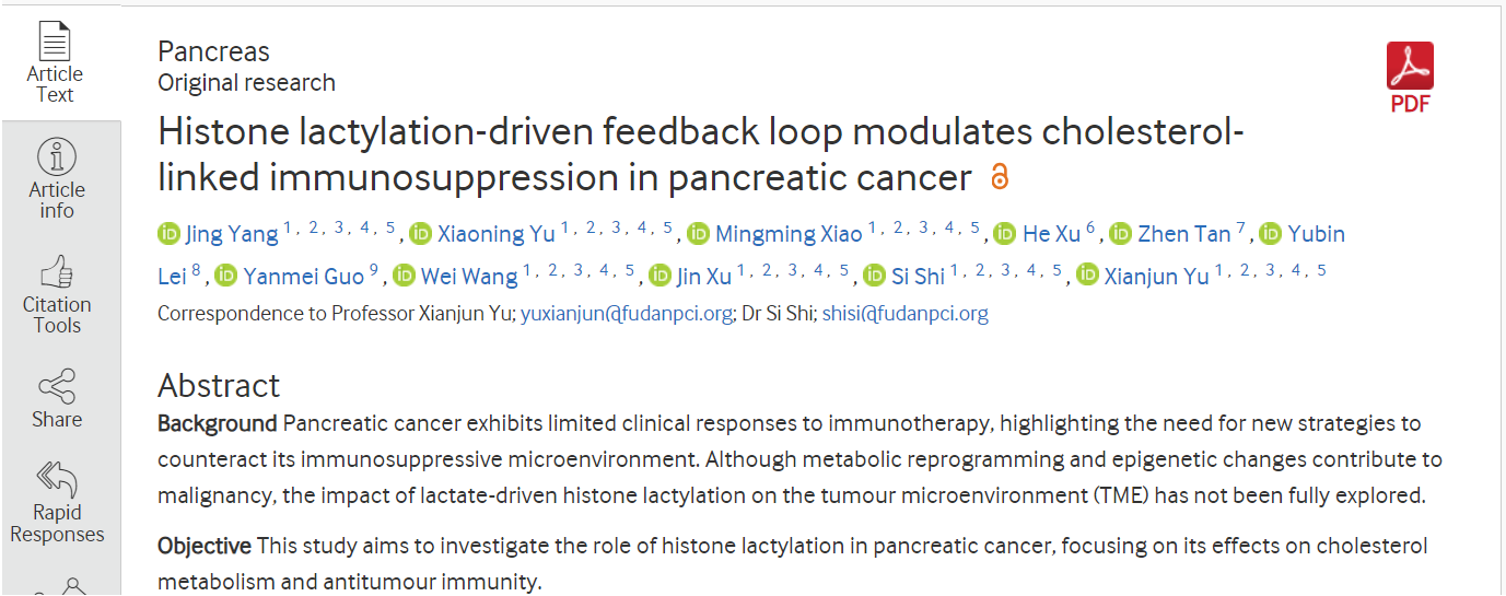 復旦大學附屬腫瘤醫院院長虞先濬教授、施思教授團隊在國際權威學術期刊《消化道》(GUT)發表最新研究成果,揭示了乳酸在胰腺癌免疫微環境中的關鍵調控作用。研究首次系統闡明瞭乳酸通過驅動組蛋白乳酸化修飾,構建了“乳酸代謝-表觀遺傳-膽固醇免疫抑制軸”的全新機制,為破解胰腺癌的免疫治療難題提供了全新策略。