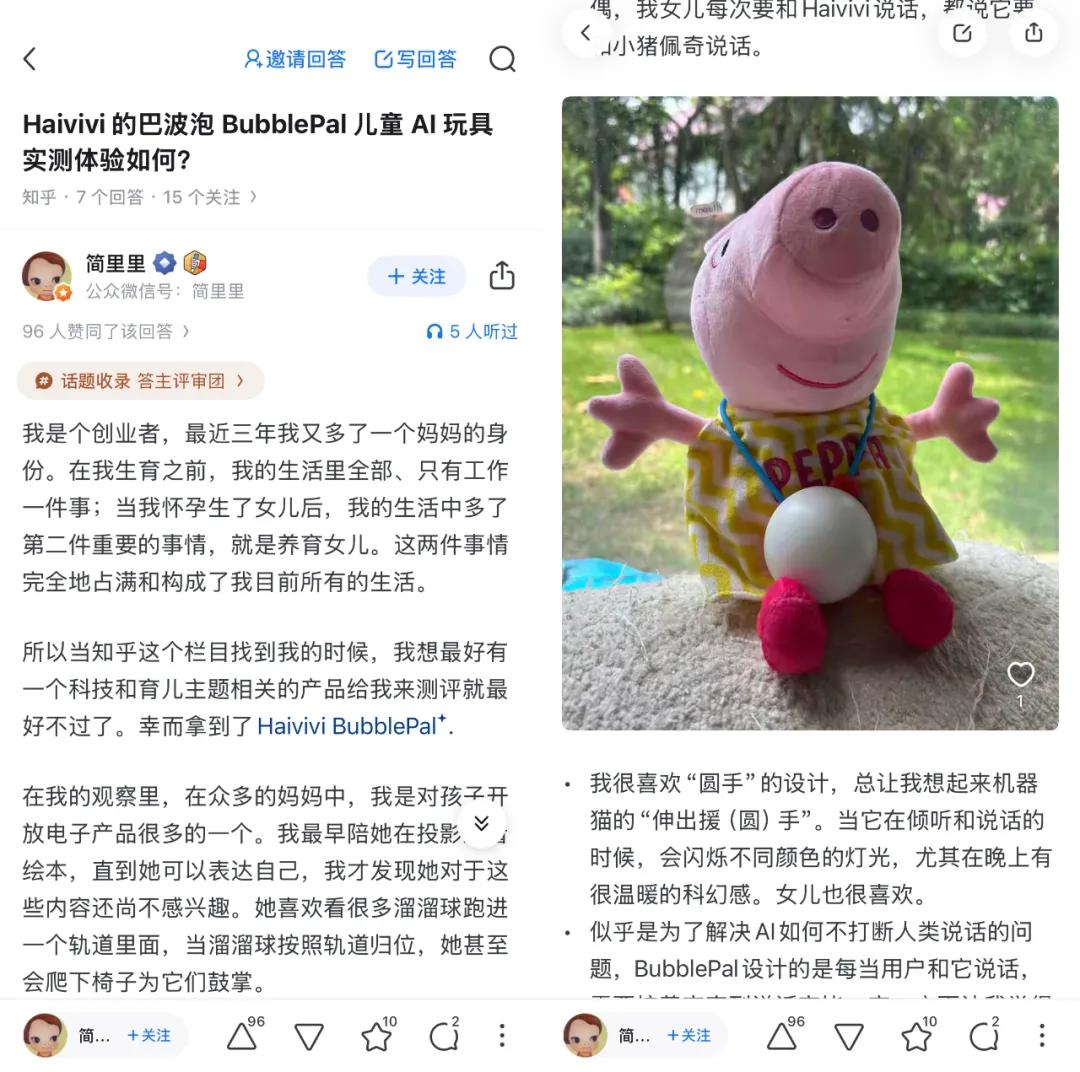 簡單心理創始人簡裏裏,以心理學從業者和兩歲孩子母親的雙重身份,用半個月時間全面記錄了女兒與Haivivi巴波泡兒童AI玩具的互動過程。她特別注意到這款玩具能敏鋭捕捉孩子情緒變化,通過温柔講故事或唱歌給予安全感,在興奮時又能激發探索慾望。在日常使用中,簡裏裏也發現AI技術並不會主動剝奪人與人相處、相愛的空間,AI玩具更像是成為了“加入家庭的第三個朋友”。這種專業視角與生活場景的深度融合,使測評內容既具備學術嚴謹性,又保持着家庭日常的煙火氣。