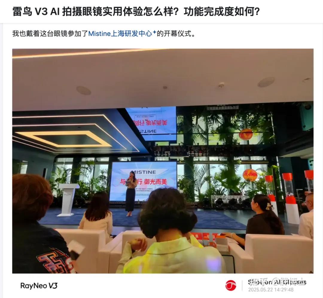 湖州觀辰生物科技有限公司的創始人胖博士,也是知乎的一位美妝護膚領域答主。此次他對雷鳥智能眼鏡做測評,佩戴產品在户外騎行、親子攝影、商務會議等多元場景中,通過連續真實的使用,不僅驗證着眼鏡的功能性、顯示穩定性、長時間佩戴的舒適度等等,更從生活實踐者的角度,提出了對未來迭代版本的功能期待和優化建議。