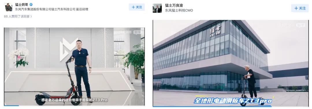 例如東風猛士科技副總經理、首席製造官CMO萬良渝和東風猛士汽車銷售服務有限公司總經理王炯,都以“開箱+好物推薦”的形式,在工廠、户外、車內等多個場景裏沉浸式、細節化測評ZT3 Pro 電動滑板車的核心賣點和亮點,包括整體機能風的設計、輪胎減震效果、剎車制動等等。