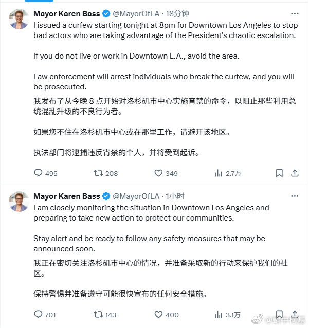 洛杉磯市長宣佈從今晚八點開始洛杉磯市中心實施宵禁。