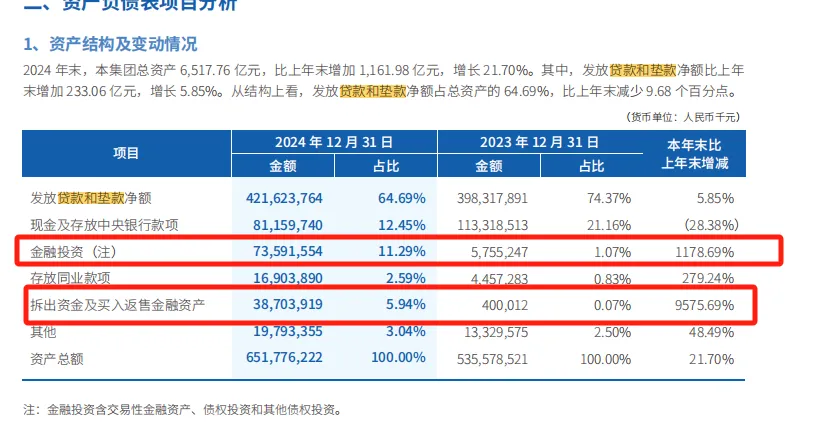 一個佐證是:2024年微眾銀行負債大幅提升超20%,而在貸餘額增長僅5%左右,負債的增量基本都投向了收益較低的金融投資和“拆出資金及買入返售資產”。