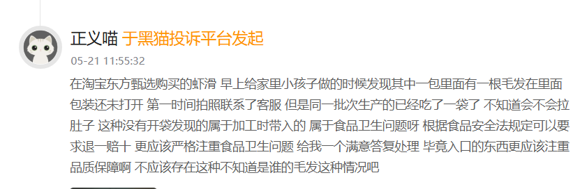 比如,有消費者在2025年5月17日投訴稱,自己購買的東方甄選的豬蹄,“到貨後發現豬蹄發黴,客服不按食品安全法處理。 ”而5月21日,則有消費者發起投訴,表示自己在東方甄選購買的蝦滑“裏面有一根毛髮……包裝還未打開,第一時間拍照聯繫了客服,但是同一批次生產的已經吃了一袋了,不知道會不會拉肚子。”並表示,“這種屬於加工時帶入的,屬於食品衞生問題呀。 ”