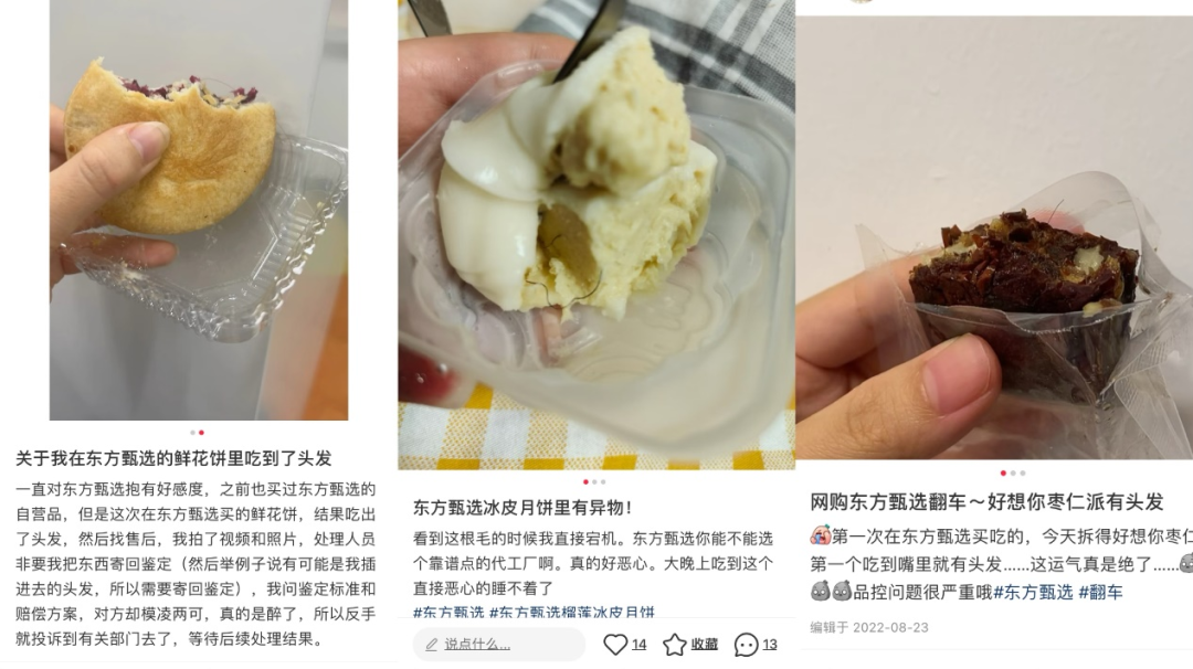 不僅如此,在小紅書、微博等社交平台,更是有不少消費者分享自己的“踩雷”經歷。有不少網友提到自己在東方甄選購買的鮮花餅、棗仁派、冰皮月餅等食品裏出現了不明毛髮,或是在羊肉卷或小麪包裏發現了塑料。