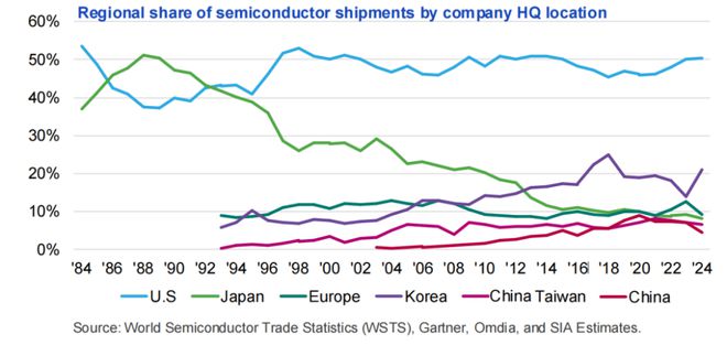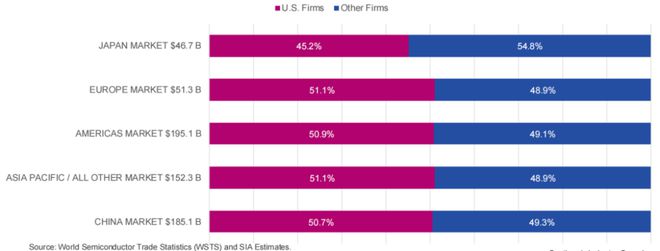 美國本土半導體公司在主要區域性半導體市場中保持市場份額領先地位
