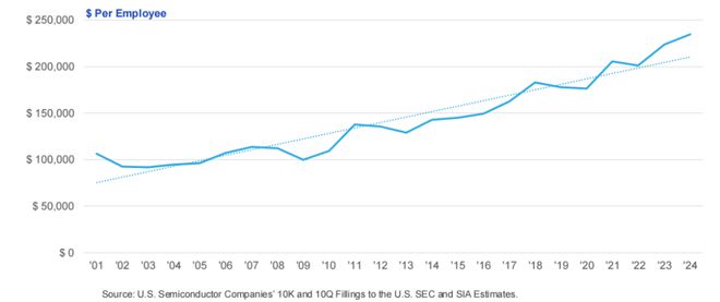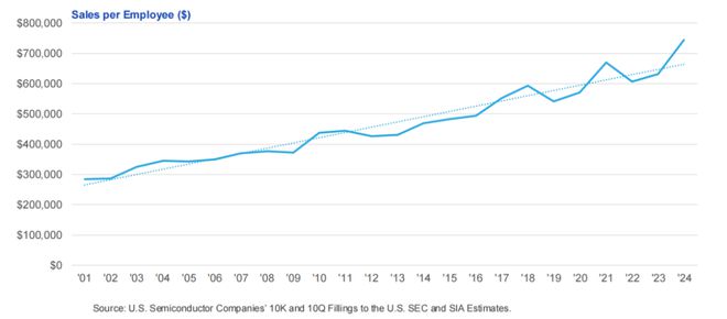 自2001 年以來,美國半導體行業的勞動生產率已提升超一倍。這些生產率的提升得益於持續高水平的資本投入和研發支出。2024 年,美國半導體行業記錄的人均銷售收入超過 744,312 美元。