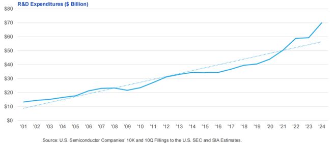 美國半導體行業研發支出持續高企,反映研發對半導體生產的內在重要性。