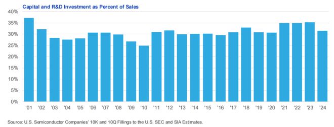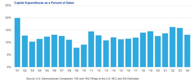 美國半導體行業資本密集度高,年度資本設備支出佔銷售額比例往往較高。