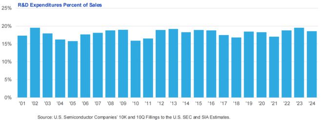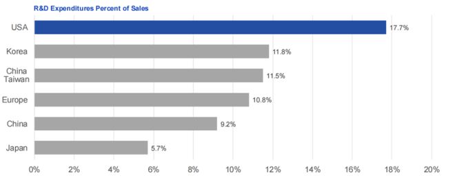 美國半導體行業研發支出佔銷售額的比例,超過其他任何國家或地區的半導體行業。