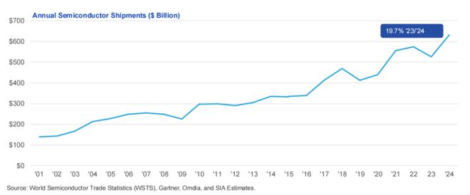 全球半導體銷售額從2001 年的 1390 億美元增長至 2024 年的 6305 億美元,年均複合增長率達 6.8%。根據世界半導體貿易統計(WSTS)2024 年秋季半導體行業預測,全球半導體行業銷售額預計 2025 年將增至 6972 億美元,2026 年進一步增至 7386 億美元。