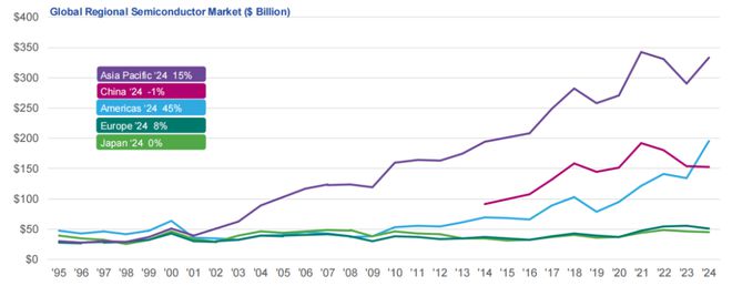 2001 年,隨着電子設備生產向亞太地區轉移,亞太市場的銷售額超過了所有其他地區市場。此後,其規模不斷擴大,從 398 億美元增長到 2024 年的 3334 億美元。迄今為止,亞太地區最大的單一國家市場是中國,其銷售額約佔亞太市場的 46%,佔全球市場總額的 24%。由於對高價值產品的出口管制以及其他地區的強勁增長,2022 年起對華出貨量有所下降。該數據僅反映半導體向電子設備製造商的銷售情況 —— 含有半導體的最終電子產品隨後會被運往全球各地消費。