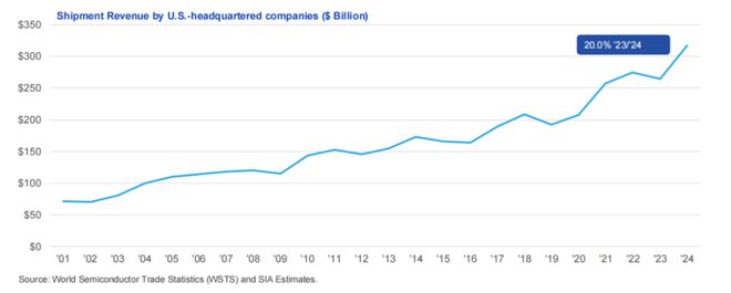 美國總部半導體公司的銷售額從2001 年的 711 億美元增長至 2024 年的 3182 億美元,年均複合增長率為 6.7%。美國總部企業的銷售增長與整個行業一樣,呈現出週期性波動特徵。