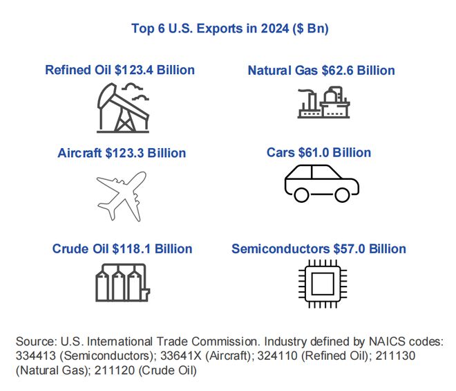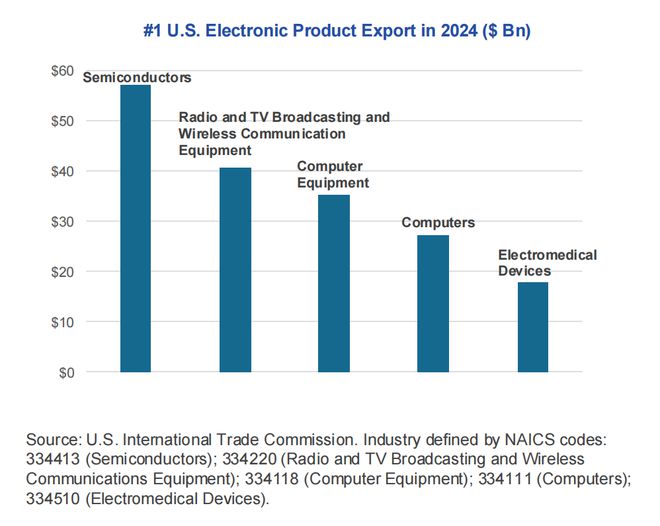 2024 年美國半導體出口額達 570 億美元,在美國出口產品中排名第六,僅次於精煉石油、飛機、原油、天然氣和汽車。半導體在美國所有電子產品出口中佔比最大。