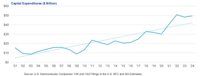 2024 年,美國半導體行業的資本支出總額為 495 億美元。由於 1999-2001 年間主要新設施的建成以及晶圓代工廠使用的增加,2001-2003 年資本支出有所下降。2004 年出現反彈,到 2005 年,該行業的資本支出佔銷售額的比例處於平衡狀態。2009 年,由於全球經濟衰退,資本支出大幅下降,2011 年反彈至 237 億美元。2022-2023 年,資本支出從 507 億美元略微下降至 482 億美元。不過,自 2001 年以來,資本支出的年增長率為 5.2%。