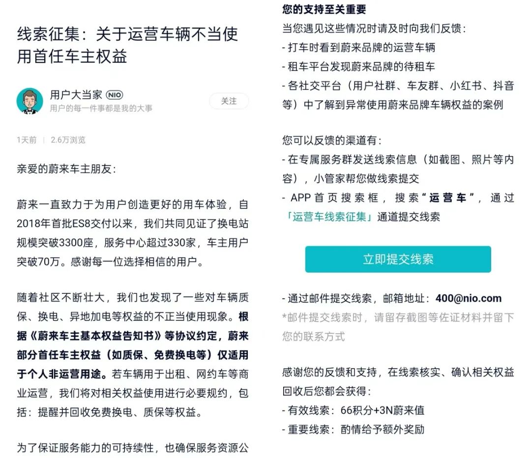 6月10日,蔚來在其官方App上線了一個線索徵集入口,讓車主留意在打車、租車平台遇到的蔚來品牌車輛,以及在各社交平台的蔚來品牌車輛權益異常使用案例。車主只需將相關截圖或照片發給專屬服務羣管家,便可以在線索核實有效後獲得積分、蔚來值等獎勵。