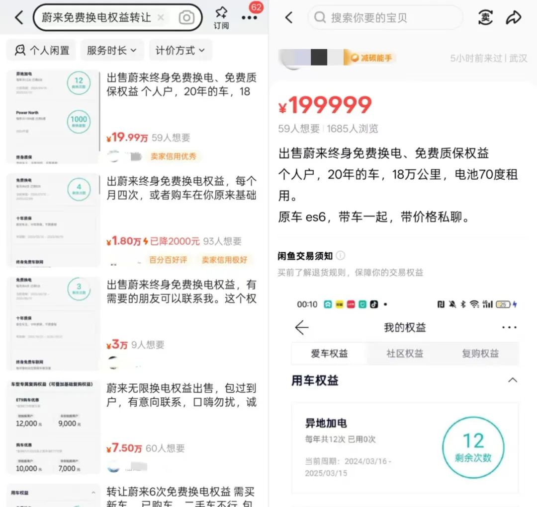 在閒魚和小紅書等平台上,“蔚來免費換電權益過户”是一個熱度不低的搜索詞。據源Auto瞭解,不少網友聲稱可以轉讓免費換電權益,費用數萬元不等。