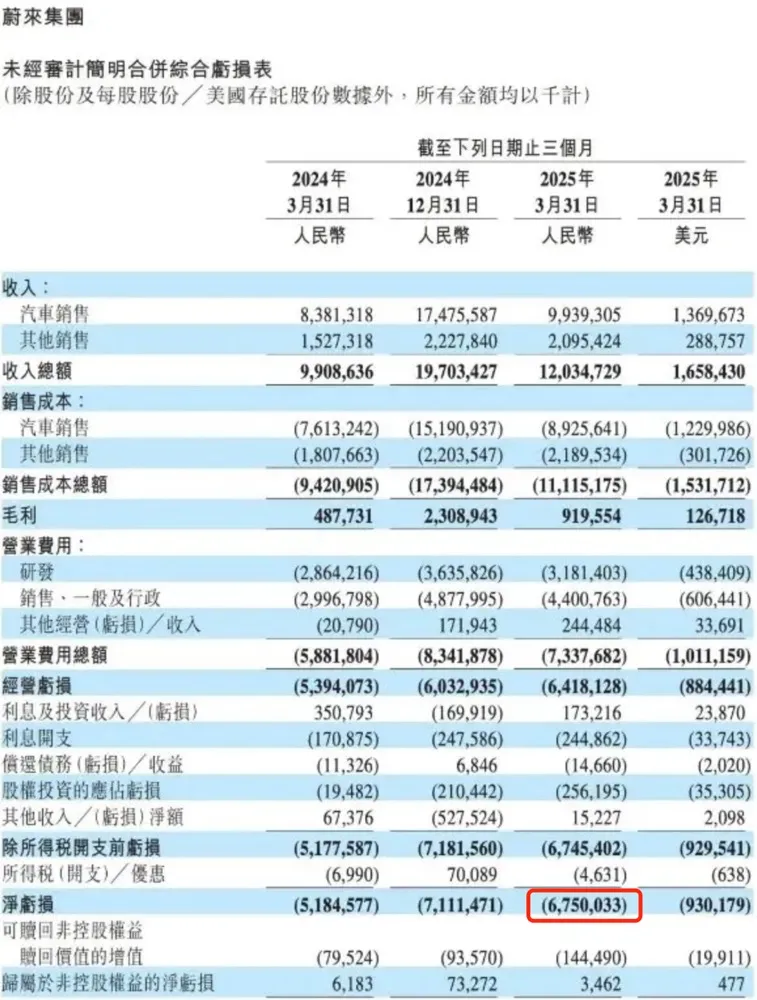 圖/2025年一季度蔚來財報部分數據