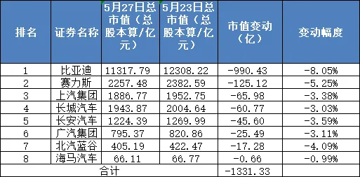 圖/5月23-27日A股乘用車板塊市值變化