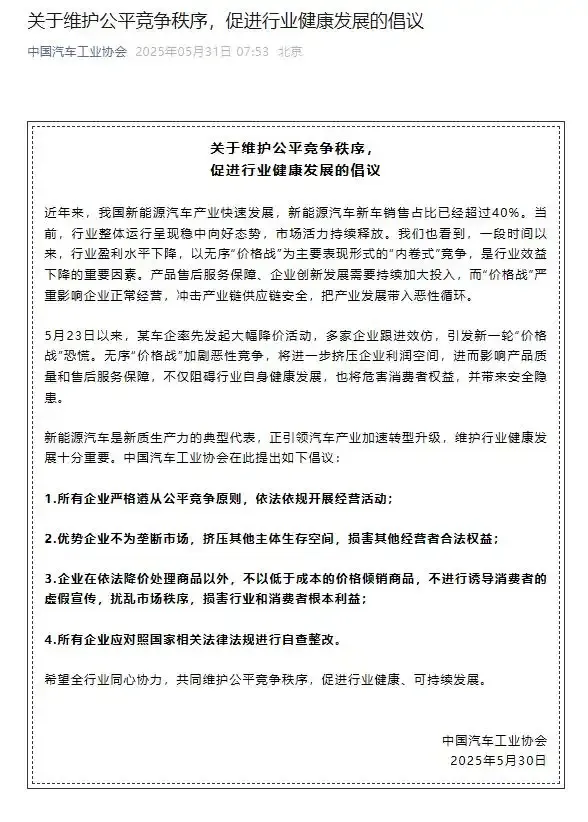 今年5月31日,中國汽車工業協會發布《維護公平競爭秩序,促進行業健康發展》倡議書,明確反對車企之間的無序價格戰。