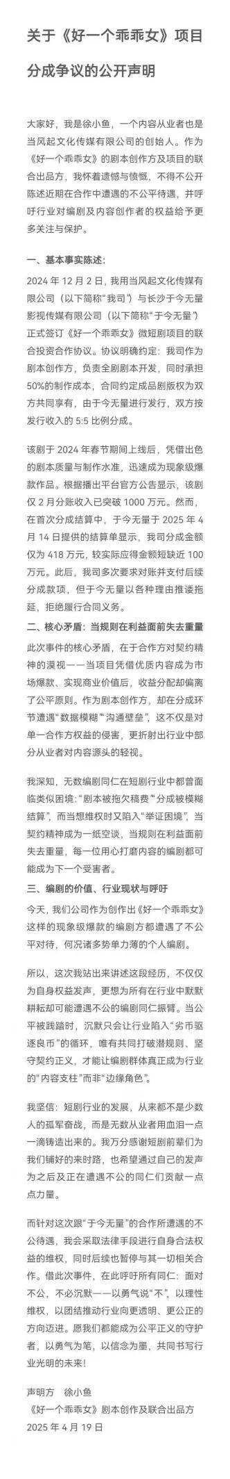“和長視頻平台合作必須要有很厲害的項目背書或者資源”,曉桐告訴《號外工作室》,個人和小團隊很難和平台建立合作關係,另外,承接方容易遇到分賬糾紛,比如熱門短劇《好一個乖乖女》就曾分賬不均等糾紛。