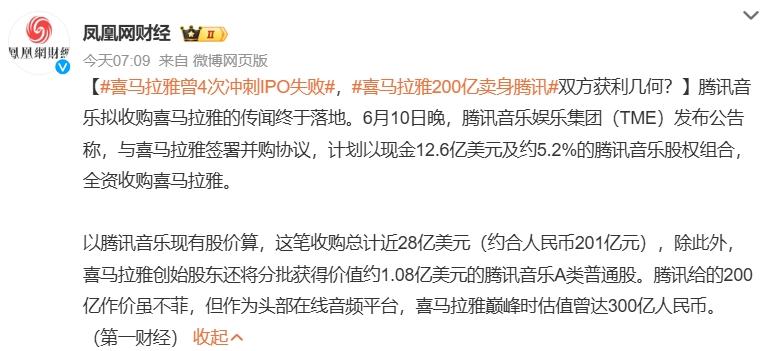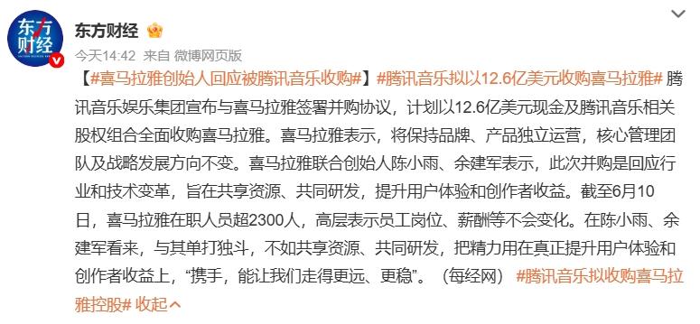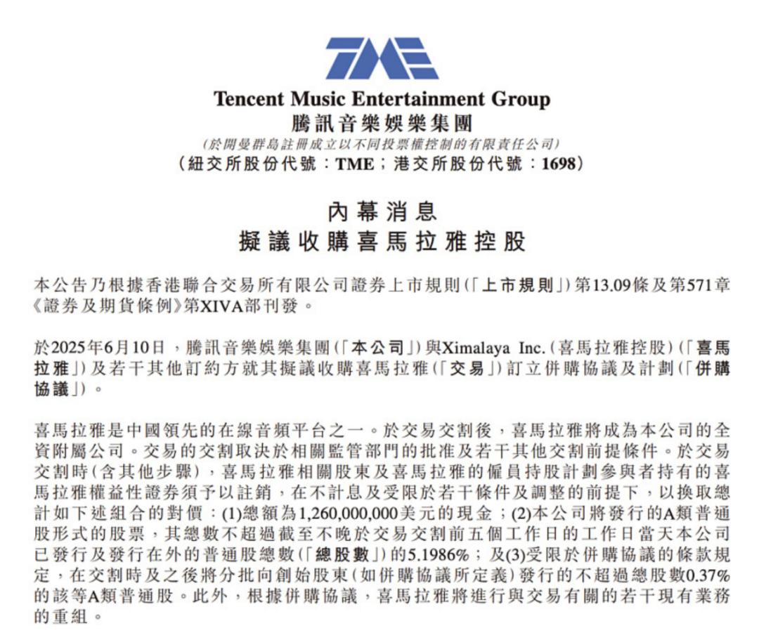 6月10日,騰訊音樂娛樂集團(以下簡稱“騰訊音樂”,TME、HK1698)正式宣佈以12.6億美元現金加股權的形式全資收購喜馬拉雅;收購完成後,喜馬拉雅將成為騰訊音樂旗下的全資附屬公司。