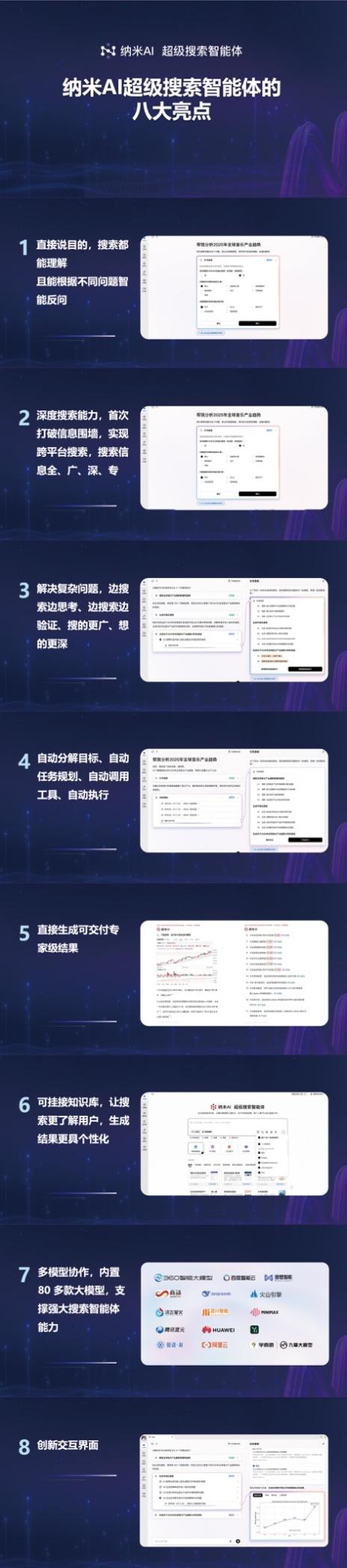 據介紹,納米AI超級搜索智能體的八大核心亮點包括: