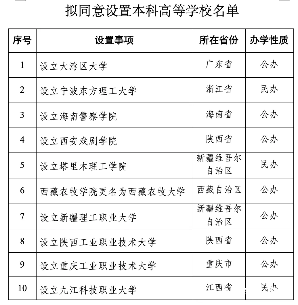 今天(6月11日),教育部發布《關於擬同意設置本科高等學校的公示》。根據《中華人民共和國高等教育法》《普通高等學校設置暫行條例》《普通本科學校設置暫行規定》《本科層次職業學校設置標準(試行)》等有關規定以及第八屆全國高等學校設置評議委員會考察評議結果,經教育部黨組會議審議,擬同意設置大灣區大學等10所學校,現予公示。