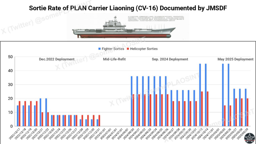 持續關注中國海軍發展的國外博主“SomePLAOSINT”,通過分析日本統合幕僚監部發布的例行通報得出結論稱:在今年5月25日~5月26日期間,在東海水域進行戰巡的中國海軍“遼寧”艦航母編隊的殲-15艦載機日均起降作業約為45架次(持續出動架次率),單機平均日出動架次率約為2架次。