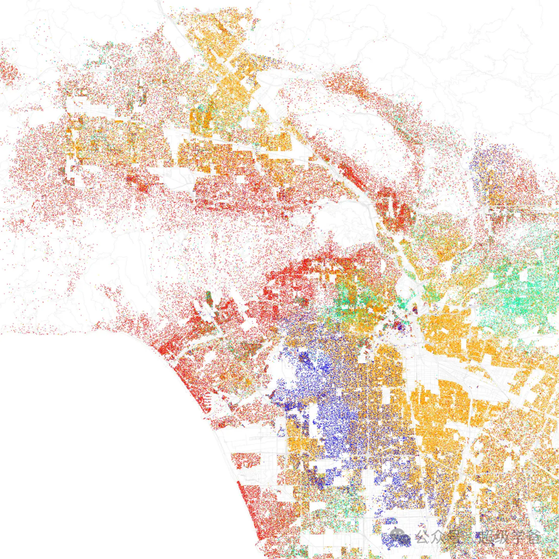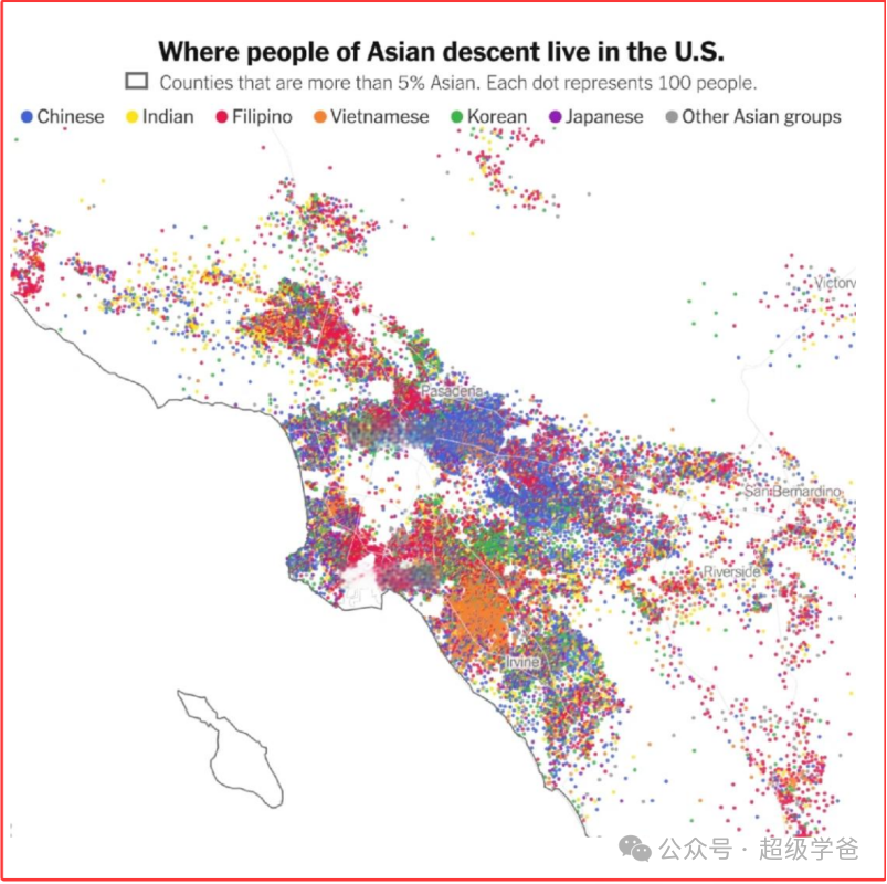 下圖是洛杉磯族裔分佈圖,紅色是白人聚居區,藍色是黑人,綠色是亞裔,黃色則是拉丁裔。而亞裔又無限可分,大家依然聚族而居(下圖)。
