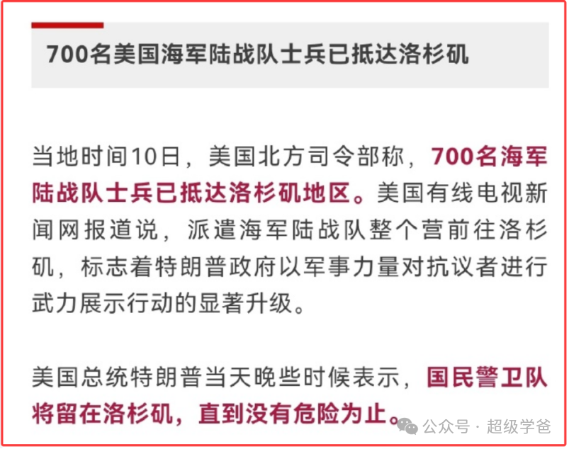 到洛杉磯抓人這招,可以説是一舉多得,既能狠狠打擊對手,又能鞏固自己的基本盤,何樂而不為。對懂王乃至共和黨來説,深藍州越亂越好。