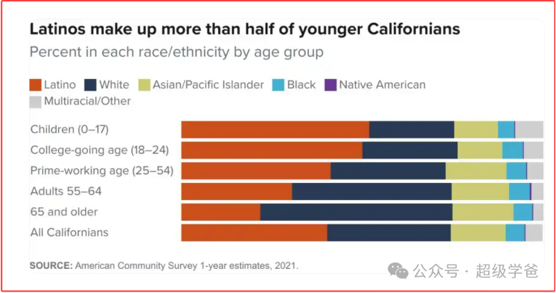 説個觸目驚心的事情,加州的拉美裔已經超過40%,其中1-17歲的人羣中,拉美裔已經超過了50%。而在洛杉磯,拉美裔已經超過了總人口的50%,未成年人已近60%。