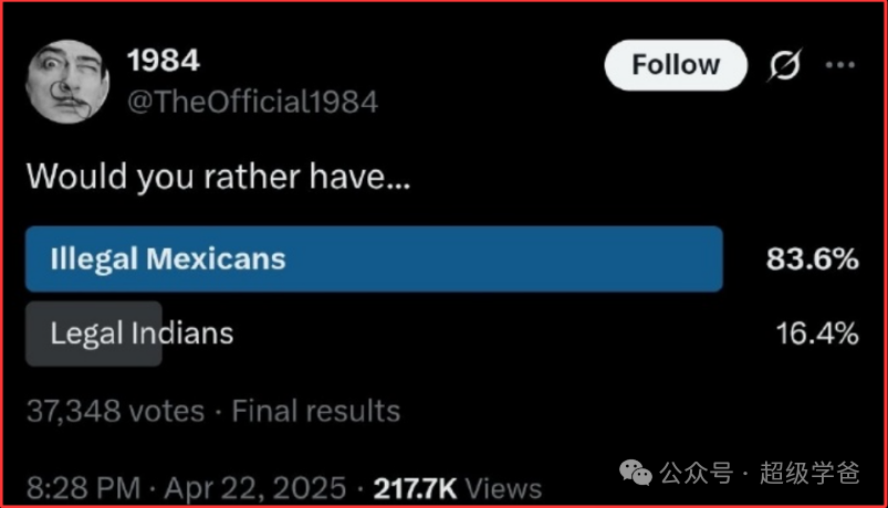 推特上有個投票,問你願意要印度的合法移民,還是願意要拉美的非法移民。結果答案讓三哥破防了,因為83.6%的人選擇拉美的非法移民。看來美國人也有清醒的一面。