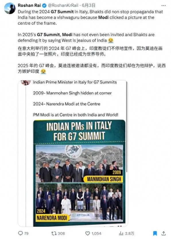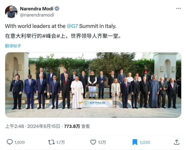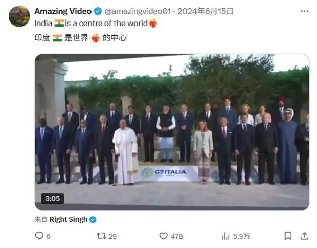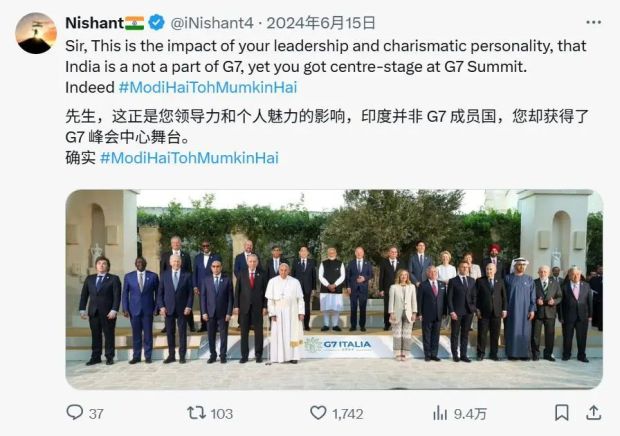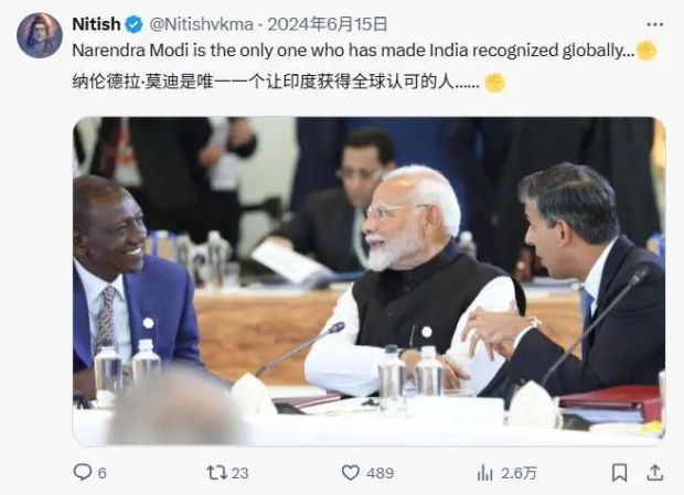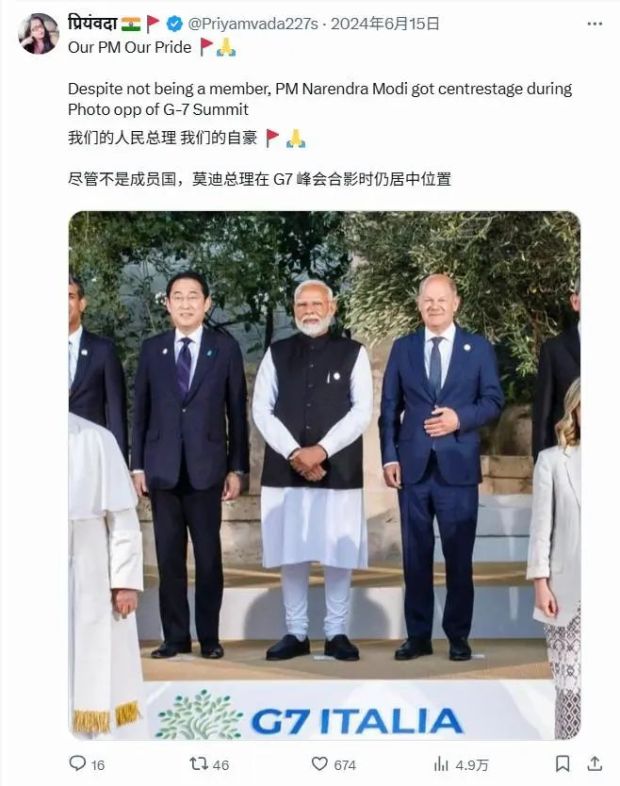 大家別看印度人現在這麼傲嬌,去年莫迪赴意大利參加G7峯會的時候,他們的反應可完全不是這樣的。相關帖子直到現在還在莫迪的個人X號上掛着,評論區裏洋洋灑灑幾千條留言,幾乎全是印度網民在給他們的莫迪gege花樣吹彩虹屁的。其中被吹得最多的一條,就是莫迪和其他赴會要人在G7峯會間隙的那張大合影——因為莫迪在合影時,恰好被安排到了第二排的中間位置,介於時任日本首相岸田文雄和時任德國總理默茨之間。