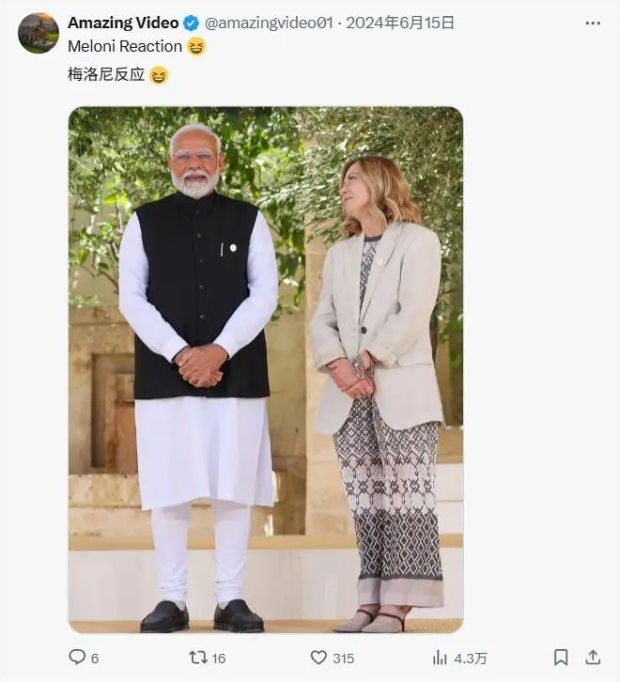 這個看似無足輕重、實際上也無足輕重的細節,可把莫迪粉圈裏的那羣狂熱粉絲給激動壞了。他們紛紛在評論區刷起了各種給莫迪抬轎子的回覆,“Sir,這正是您無與倫比的領導力和個人魅力的體現啊!印度雖然不是 G7 成員國,您卻獲得了站在G7峯會舞台中心的機會!”“哦!我們的莫迪總理,我們為您感到自豪!儘管印度不是成員國,可莫迪總理卻在G7峯會合影時站在C位上!”“此刻的印度,是世界的中心!”“你們看到梅洛尼(意大利領導人)看莫迪的眼神了嗎?簡直就像個花痴一樣。”