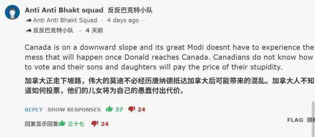 “加拿大不過是個江河日下的過氣國家,川普以美國領導人身份抵達加拿大後,不知道還要經歷怎樣的混亂,我們偉大的莫迪總理不遭這個罪是好事一樁。加拿大人根本不知道應該如何投票,居然把卡尼這種蠢貨選了上來,加拿大人的子孫後代都將為自己的愚蠢付出代價。”