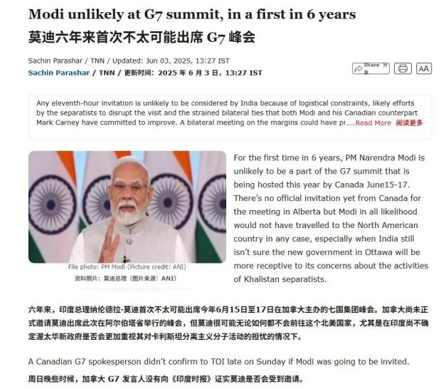 不管怎麼説,反正今年的G7峯會莫迪大概率是去不成了,這話可不是我腦補的,而是《印度時報》自己把窗户紙捅破的。大概是為了挽尊的緣故,所以《印度時報》還在報道中用了一個非常具有印度特色的春秋筆法:《6年來首次,莫迪不太可能出席G7峯會》——沒説加拿大請不請,只説莫迪不太可能去,不明就裏的人看了,還以為是莫迪不樂意才不去的。