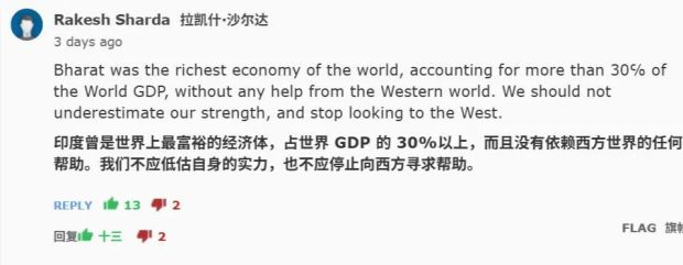 “印度曾是世界上最富裕的經濟體,僅我們一家體量就佔到了全世界GDP的30%以上——而且沒有依賴西方世界的任何幫助。我們印度人就是太不自信了。印度不應該如此低估自身的實力,是時候停止對西方的幻想了。”