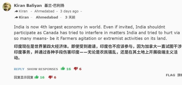 “印度現在已經是世界第4大經濟強國了。別説加拿大沒請,就是請了印度也不該去。因為加拿大太壞了,一直試圖干涉印度的內政,並通過各種手段傷害印度。”